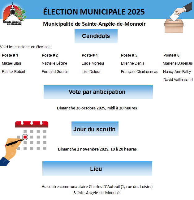 Élection municipale 2025 Sainte-Angèle-de-Monnoir2025-10-24T08:16:25-04:00 Partagez cette page sur les réseaux sociaux FacebookXLinkedInPinterestEmail