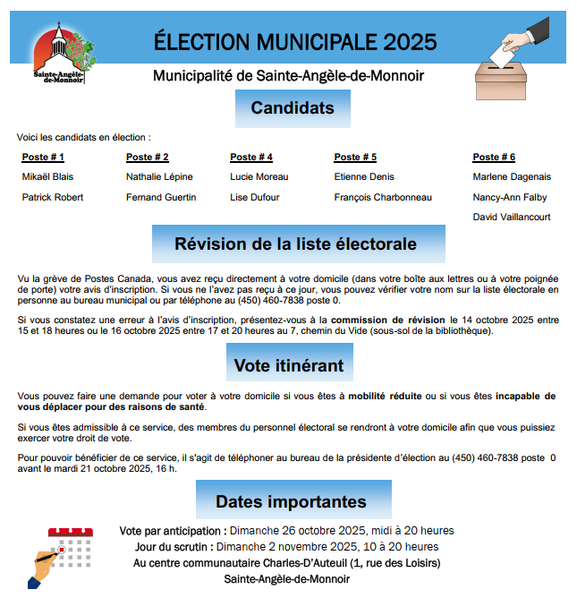 - Vote par anticipation : Dimanche 26 octobre 2025 entre midi et 20 heures (1, rue des Loisirs)